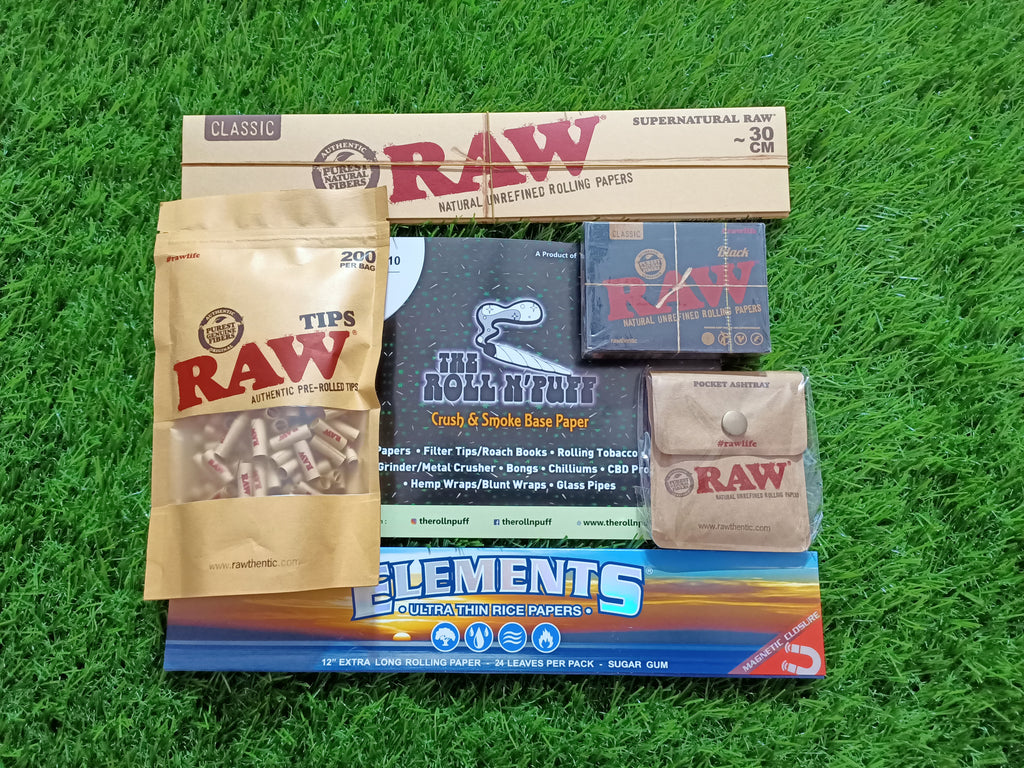 The Roll N Puff Presents THE BIG DADDY COMBO.This Combo Features Supernatural 12Inches Rolling Papers By RAW & ELEMENTS & Pre Rolled Filter Tips.