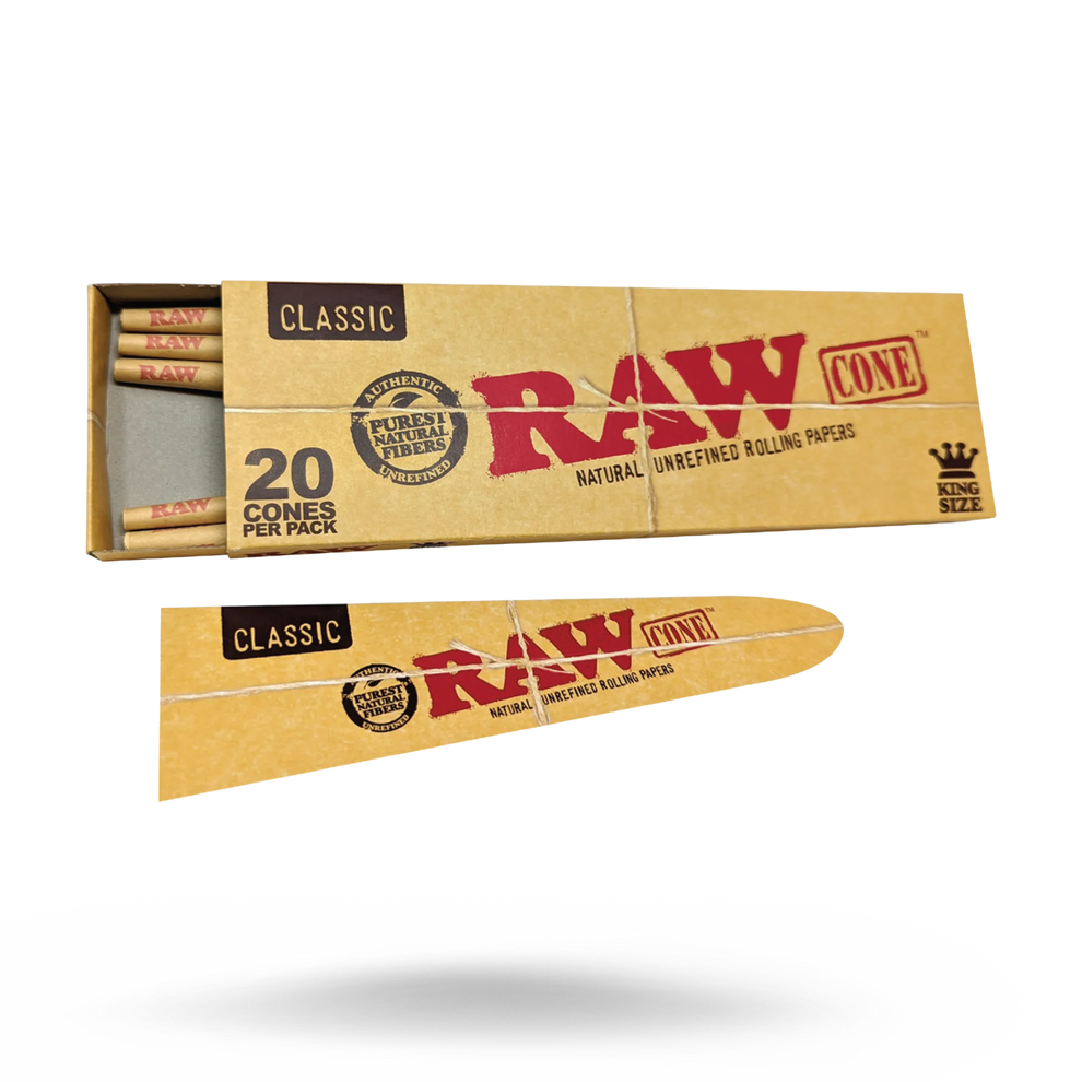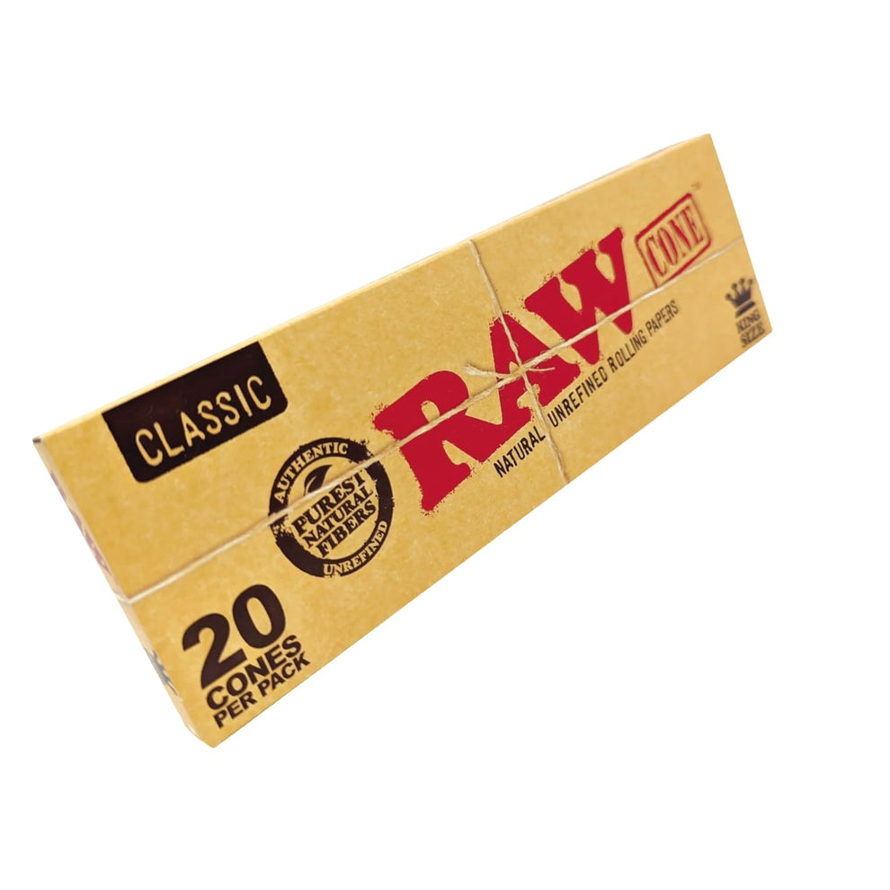Experience the ultimate convenience and quality with RAW Classic Cone King Size - 20 Pre-Rolled Cones. Each pack contains 20 meticulously crafted pre-rolled cones. Crafted from unbleached and chlorine-free paper, these cones offer a natural smoking experience with filters for an even burn and comfortable draw. Enjoy smoother and more flavorful smoking sessions with RAW.