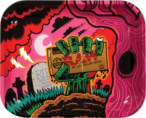 You’re ready to roll with the undead on this large metal rolling tray featuring blood-curdling RAW Zombie Smoker. Who wouldn’t return from beyond for one more quality smoke with RAW!